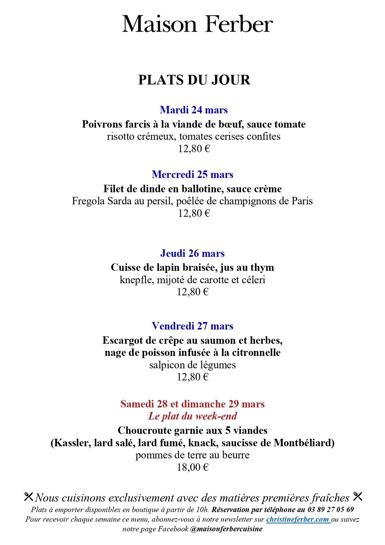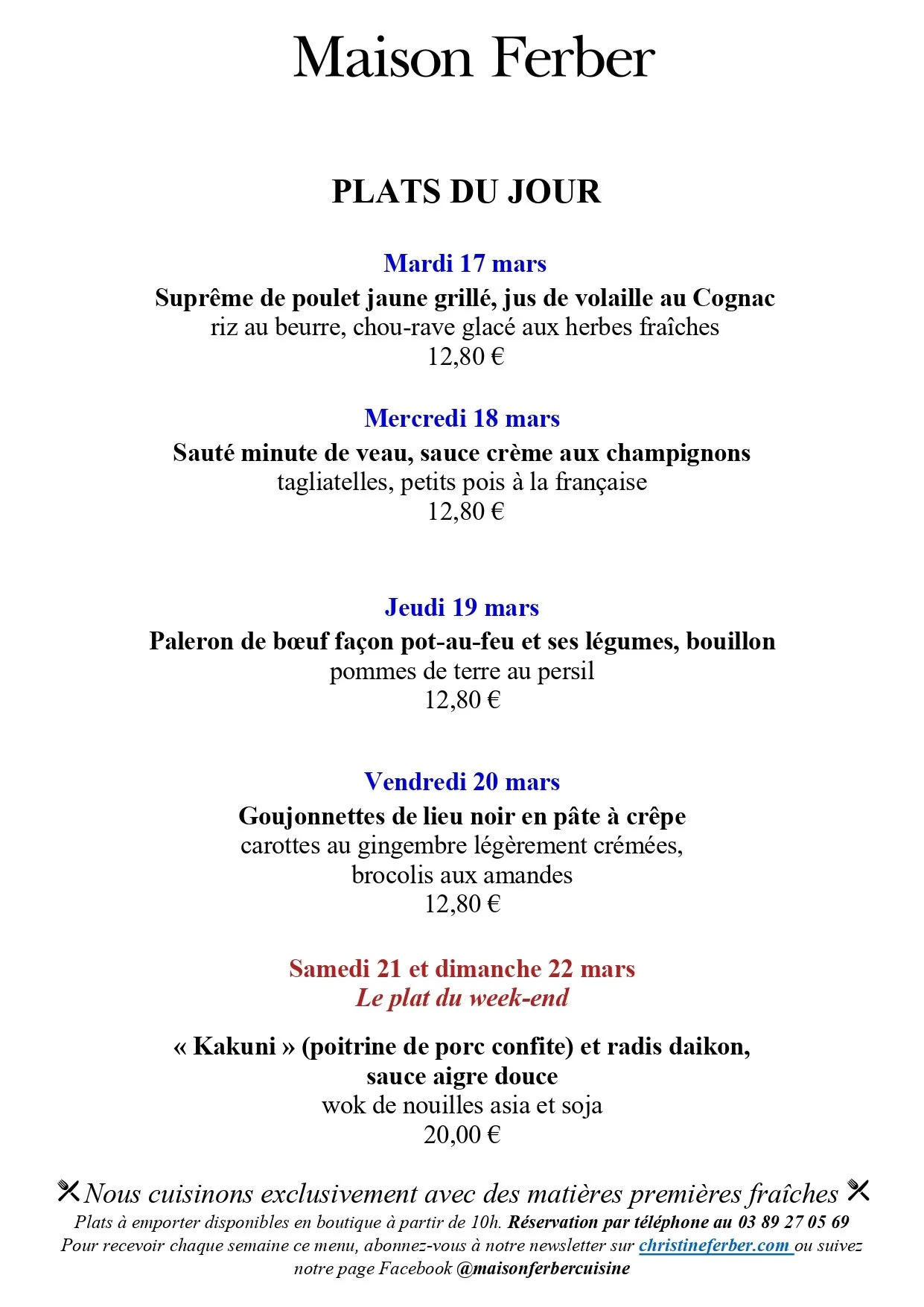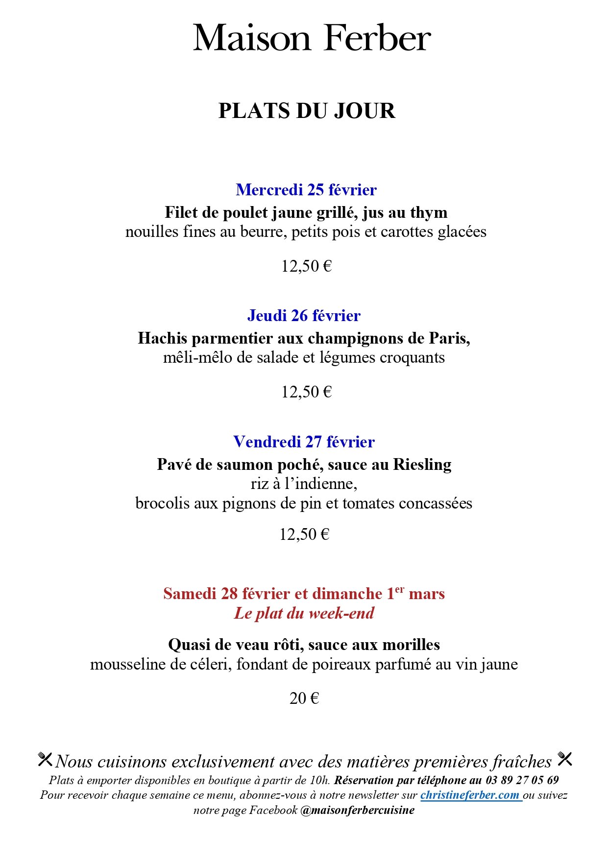 Nos cuisiniers ont le plaisir de vous proposer un service de plats du jour à emporter du mardi au dimanche. Ces plats à réchauffer chez vous sont disponibles en retrait boutique à partir de 10h.